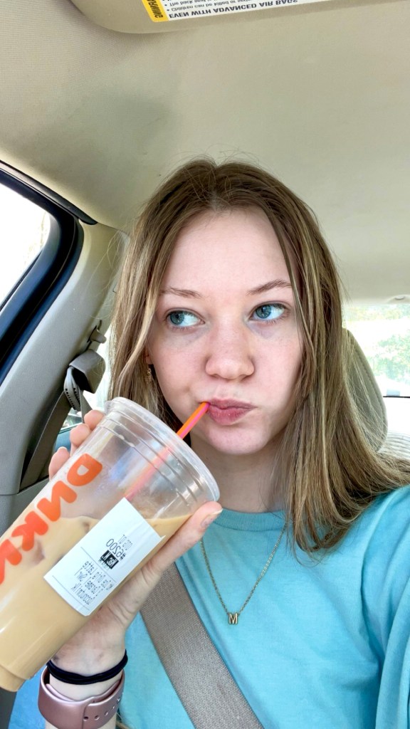 When looking through my phone for pictures of a Dunkin’ iced coffee, I realized that I didn’t have any of just the bev. Which makes sense, I mean, it’s not like the Dunkin’ cup is particularly aesthetically pleasing. So here’s me, mid-pandemic when the only coffee options were chain drive thrus, trying to decide if I liked my bev or not.